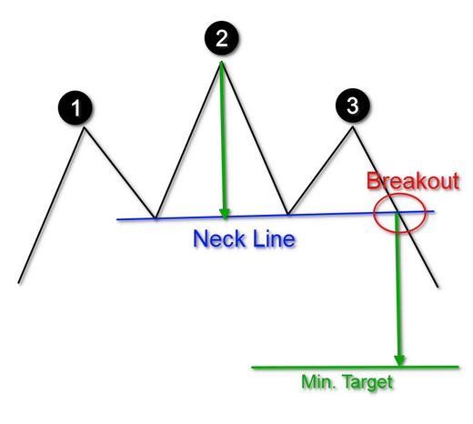 Gli acquirenti tornano presto sul mercato e alla fine passano a nuovi massimi (2)-testa). Tuttavia, i nuovi massimi vengono rapidamente respinti e il lato negativo viene nuovamente testato (continua scollatura). Gli acquisti provvisori riemergono e il mercato ritorna ancora una volta, ma non riesce a togliere il massimo precedente. Quest'ultima cima è considerata la (3)-spalla destra. L'acquisto si prosciuga e il mercato prova ancora una volta il rovescio della medaglia.